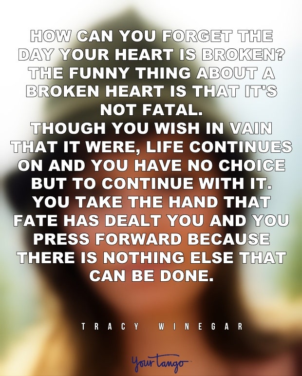 "How can you forget the day your heart is broken? The funny thing about a broken heart is that it’s not fatal. Though you wish in vain that it were, life continues on and you have no choice but to continue on with it. You take the hand that fate has dealt you and you press forward because there is nothing else that can be done."Tracy Winegar