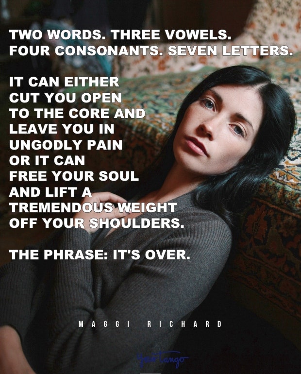 "Two words. Three vowels. Four consonants. Seven letters. It can either cut you open to the core and leave you in ungodly pain or it can free your soul and lift a tremendous weight off your shoulders. The phrase is: It’s over." Maggi Richard