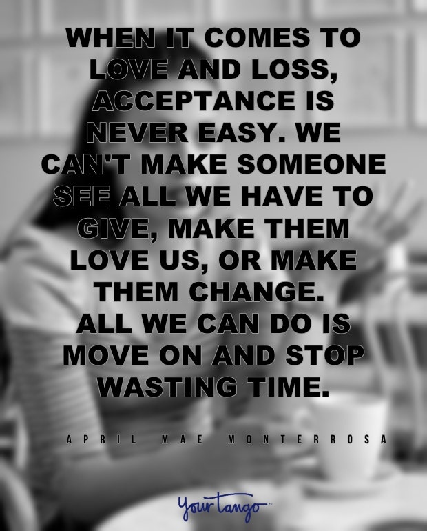 "When it comes to love and loss, acceptance is never easy. We can’t make someone see all we have to give, make them love us, or make them change. All we can do is move on and stop wasting time." — April Mae Monterrosa