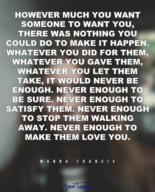 "However much you wanted someone to want you, there was nothing you could do to make it happen. Whatever you did for them, whatever you gave them, whatever you let them take, it could never be enough. Never enough to be sure. Never enough to satisfy them. Never enough to stop them walking away. Never enough to make them love you." Manna Francis