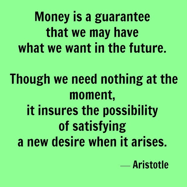 11. "Money is a guarantee that we may have what we want in the future. Though we need nothing at the moment it insures the possibility of satisfying a new desire when it arises." — Aristotle