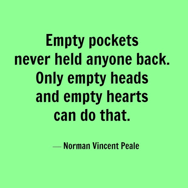7. "Empty pockets never held anyone back. Only empty heads and empty hearts can do that." — Norman Vincent Peale