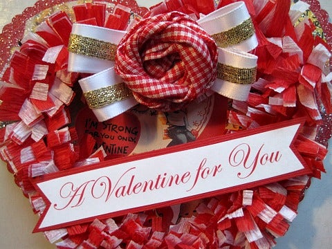 - Six layers of alternating red and white crepe paper length of circumference of heart is sewn slightly off the center line of width of crepe. (You can sew again a scissors width away from first sewn line to be able to use both halves of crepe.) Cut 1/8" slits up to sewn line length of crepe. Before separating cut crepe, hot glue sewn edge to edge of small heart. Separate crepe.