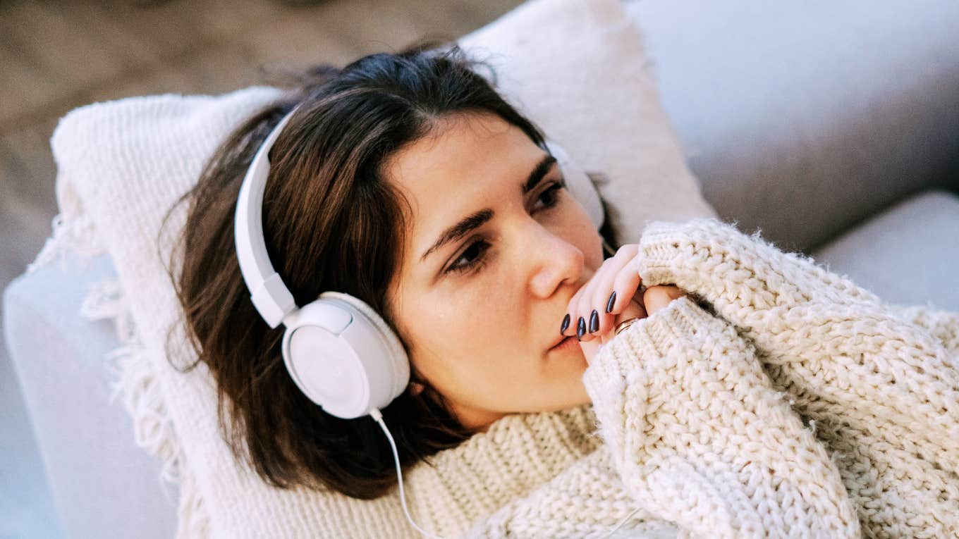A woman lying down in a quiet room wearing headphones, capturing the relatable moment of using nostalgic media to navigate the emotional pain of a recent breakup.Ivan S | Canva