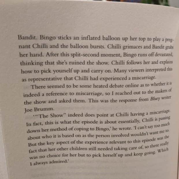 Brumm explained Chilli’s miscarriage in the book “Hard To Bear” by Isabelle Oderberg. He stated that “‘The Show’ does indeed point at Chilli having a miscarriage. In fact, this is what the episode is about essentially, Chilli is passing down her method of coping to Bingo.”