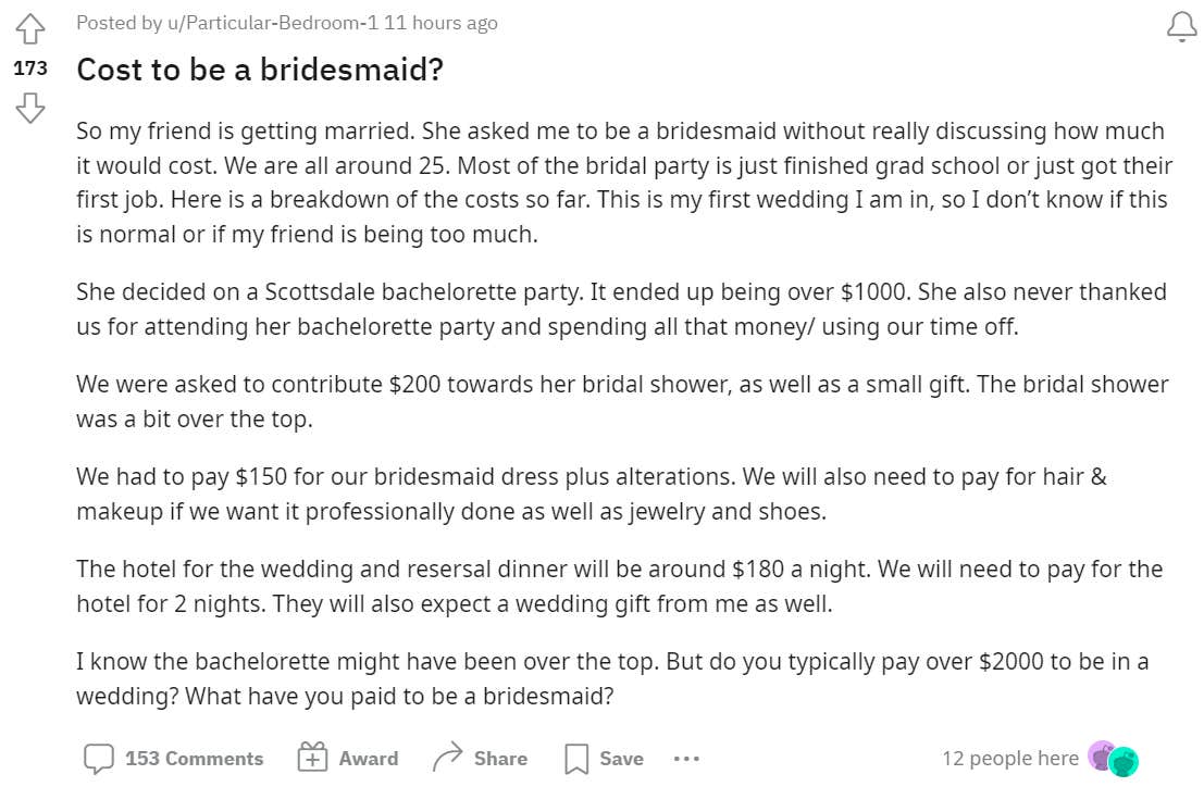 “You lost me at the Bachelorette party,” the top comment reads. “The $200 towards the shower AND a gift pushed it way over the top. $2,000+ is ridiculous.” Someone else who claimed to be a bridesmaid wrote that her costs only totaled around $450, but admitted that it was a fairly low number to pay.