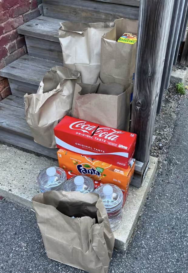 “I’m leaving them on the ground, you’re lucky I even dropped them off!” Jackie hollers. “You're welcome!” she includes a photo of all of the grocery items she would have had to carry up the stairs, including three water jugs, three boxes of canned sodas, and five brown paper bags filled with different items.