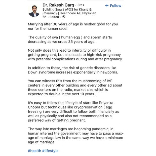 In a LinkedIn post, Dr. Rakesh Garg started by stating, “Marrying after 30 years of age is neither good for you nor for the human race! The quality of ova (human egg) and sperm starts decreasing as we cross 35 years of age.”