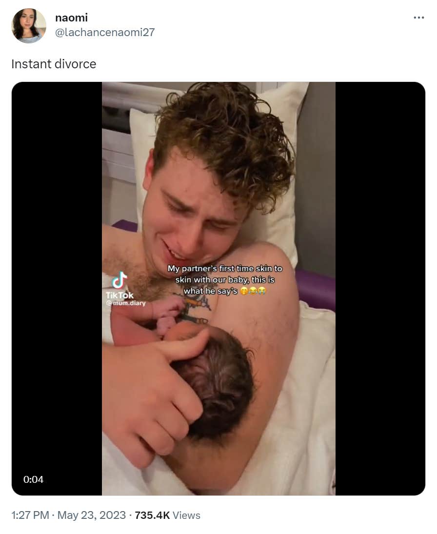 Tears start flowing after a few rocks, and he says “Oh dear, aren’t you the sweetest little thing?” The overlaid text in the video reads “My partner’s first-time skin to skin with our baby, this is what he says,” with laughing emojis, so, fortunately, Annalise finds it humorous, but it ended with her.
