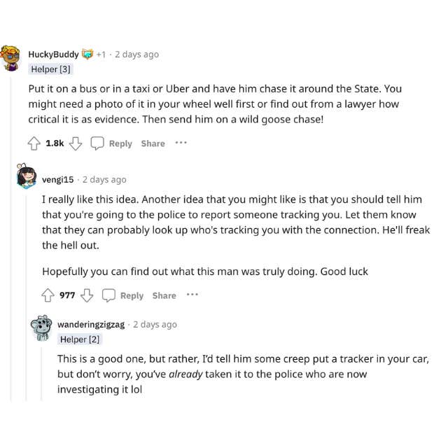 But others followed through with her question—and it must be said, they came up with some truly hilarious revenge ideas. Among the best schemes were throwing the tracker on a bus, taxi or Uber and watching the woman's husband freak out. Or, to play along with the whole thing and tell him she thinks she's being tracked and going to the police—and then watch him freak out.