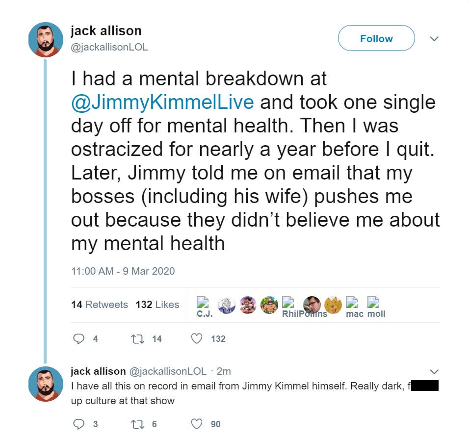 “I had a mental breakdown at @JimmyKimmelLive and took one single day off for mental health,” he wrote. “Then I was ostracized for nearly a year before I quit.”