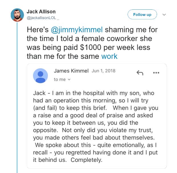 This time, Kimmel had emailed him in order to discuss a pay raise that he received which left a female coworker being paid far less for the same work.