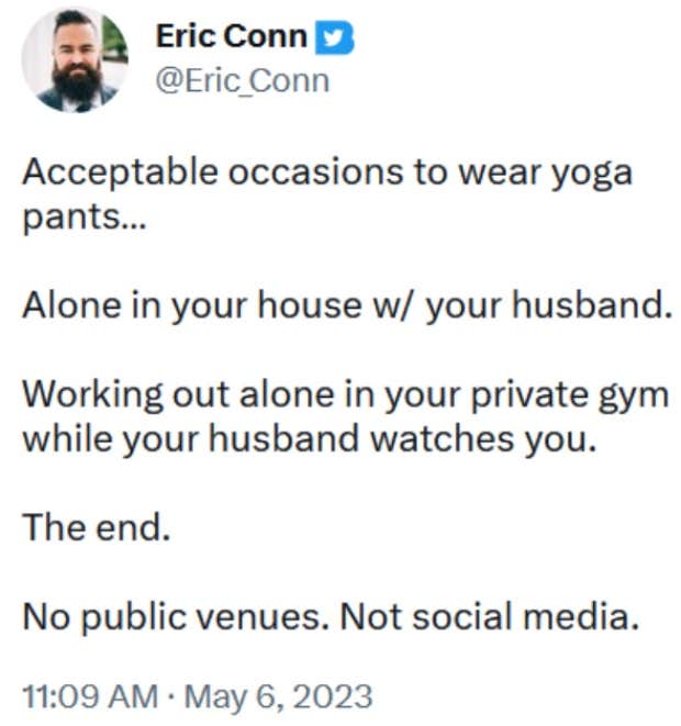 "Acceptable occasions to wear yoga pants... Alone in your house [with] your husband," Conn wrote in his Twitter post. "Working out alone in your private gym while your husband watches you. The end."