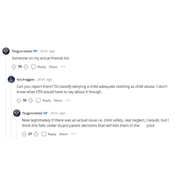 Earlier in that same thread, the man claimed that he didn’t see this incident are “real neglect,” and said that if this were some case of risking child safety, he would consider it, but “CPS is gonna look at this [and] see no issue.”