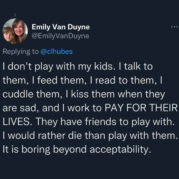 But for one mom on Twitter, writer Emily Van Duyne, playing with her kids is an actual chore—one she hates so much she tweeted she'd "rather die" than do it.