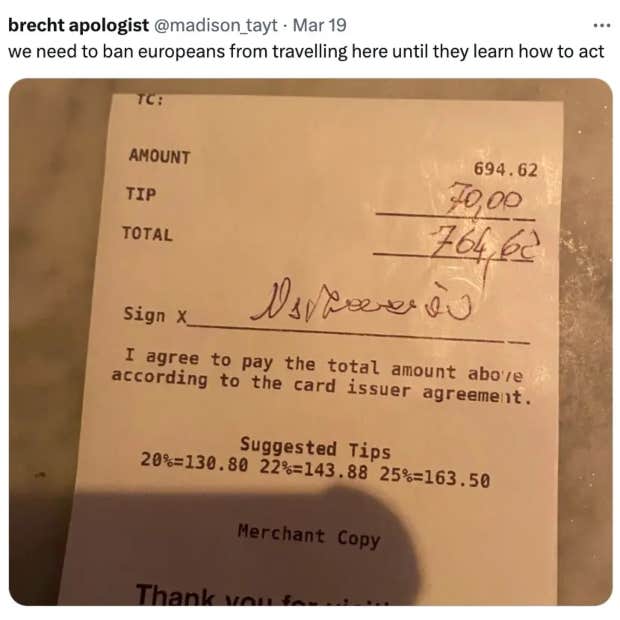 Madison Tayt, who works as a waitress, took to Twitter to vent about the European tourists refusing to abide by American tipping customs. “I f–king hate Europeans sometimes on God,” Tayt wrote in a now-deleted tweet. “This table just left $70 on a $700 check after chilling for HOURS.”