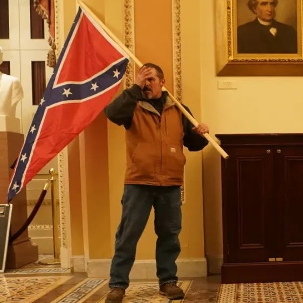 Seefried was photographed waving a Confederate flag in the Capitol on January 6 – something not even Confederates were allowed to do during the Civil War.