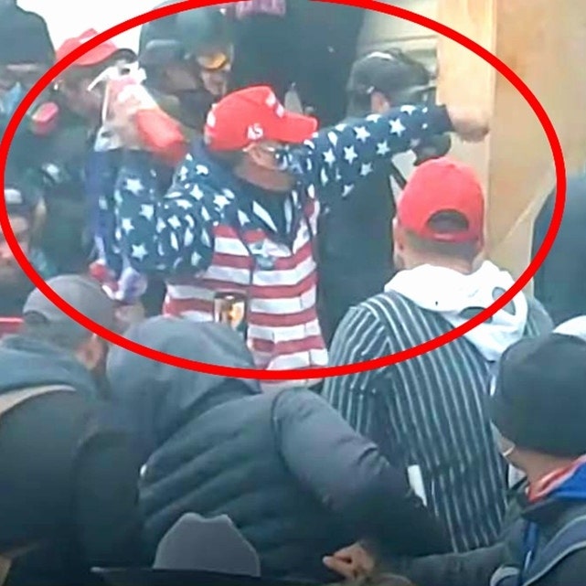 The Florida man wore a distinctive red-white-and-blue flag-styled jacket as he made his way into some of the most severe fighting on January 6.