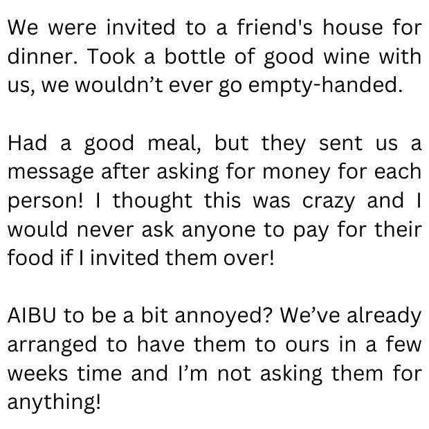 She revealed that the message her friend sent read along the lines of, “Thanks for coming last night, the steak and veggies came to £20 each.” She adds that the wine she brought over was a good-quality brand and not cheap. “I made a point to get it as I knew my friends liked wine from that region!” she wrote.