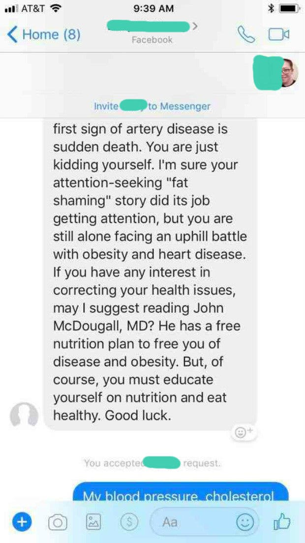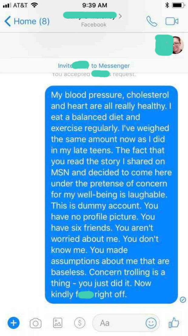 "My blood pressure, cholesterol, and heart are all really healthy. I eat a balanced diet and exercise regularly. I've weighed the same amount now as I did in my late teens. The fact that you read the story I shared on MSN and decided to come here under the pretense of concern for my well-being is laughable. This is a dummy account. You have no profile picture. You have six friends. You aren't worried about me. You don't know me. You made assumptions about me that are baseless. Concern trolling is a thing — you just did it. Now kindly --- right off."