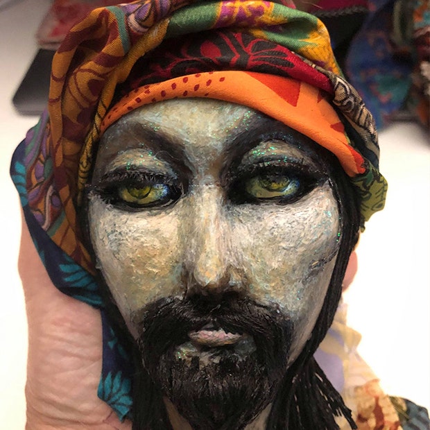 Jindal's made of Sculpey, wire, fabric, yarn — lots of sewing and gluing. Part of the thrill of making Jindal was sharing the works-in-progress with people on social media.