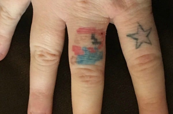 Honestly, I forget that I have tattoos so when someone comments on them, I have to think for a moment and go, “Oh! Yes, that IS Super Mario from the video game on my finger!”
