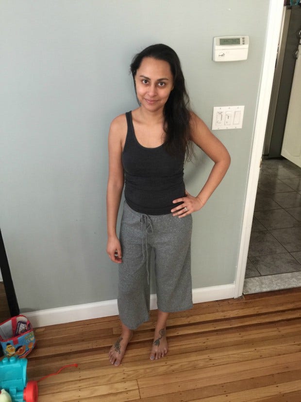 Crop pants or skirts that are cut off by the knee or lower creates the illusion of shorter legs. For day four I wore really comfortable cropped sweatpants, which was a first for me. They cut off between my knee and ankle. I didn’t pair them with shoes because I mostly stayed home and cleaned in them.