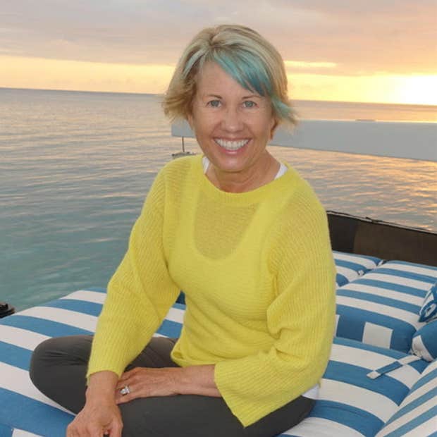 "I go out without makeup (especially after exercising or if I’m on the beach). Since I’m a painter, I do have fun “painting” my face and do enjoy putting on makeup. I like coordinating with my hair when it’s blue." —Robin, 58