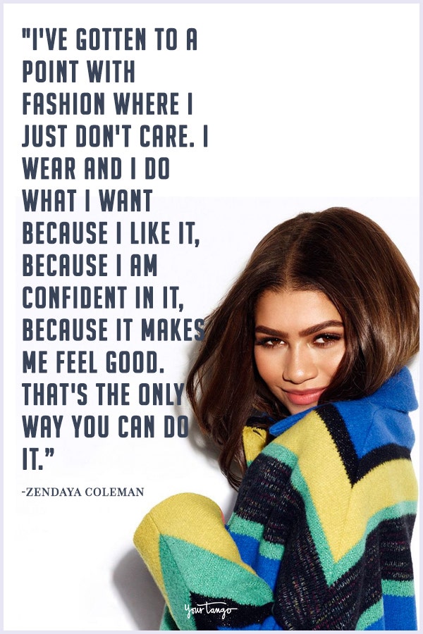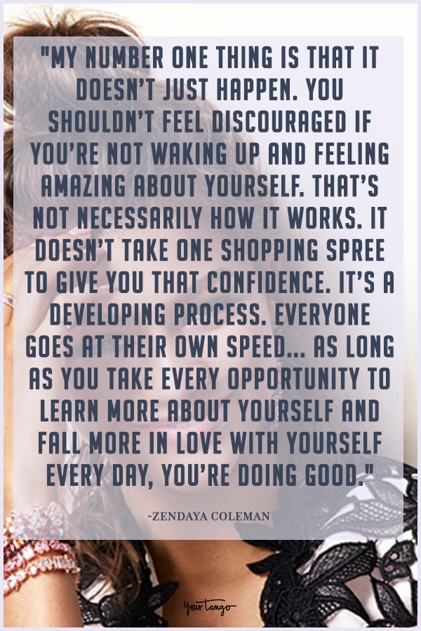"My number one thing is that it doesn't just happen. You shouldn't feel discouraged if you’re not waking up and feeling amazing about yourself. That’s not necessarily how it works. It doesn’t take one shopping spree to give you that confidence. It’s a developing process. Everyone goes at their own speed... As long as you take every opportunity to learn more about yourself and fall more in love with yourself every day, you’re doing good."— Zendaya