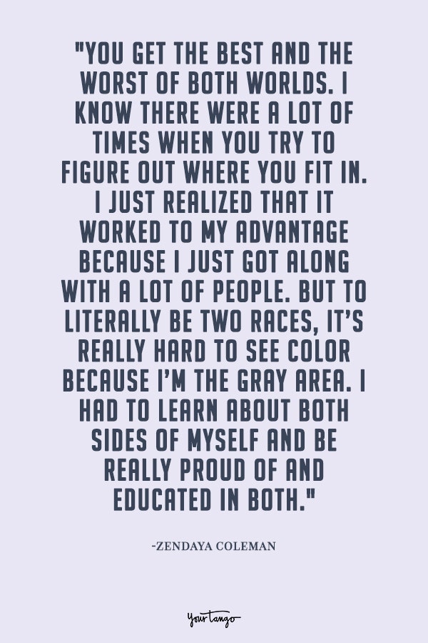 "You get the best and the worst of both worlds. I know there were a lot of times when you try to figure out where you fit in. I just realized that it worked to my advantage because I just got along with a lot of people. But to literally be two races, it’s really hard to see color because I’m the gray area. I had to learn about both sides of myself and be really proud of and educated in both."— Zendaya