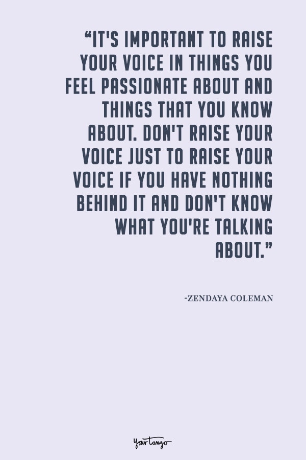 “It's important to raise your voice in things you feel passionate about and things that you know about. Don't raise your voice just to raise your voice if you have nothing behind it and don't know what you're talking about.”— Zendaya