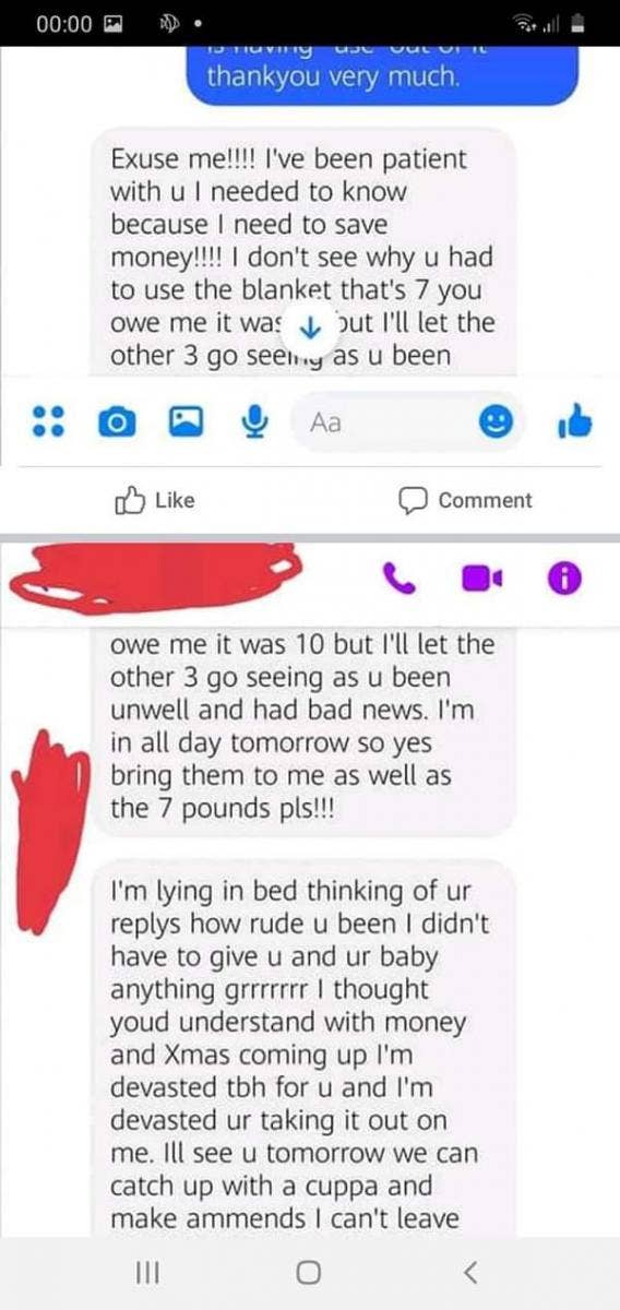 “Hey hun just wondering if you used the bits and bobs I got for the baby if not I can give them to Laura’s little one hope ur ok and resting up hun,” screenshots show the person asked in a message. She tried to justify her request, claiming that she wanted to save money for the holiday season. “Let me know hun before I by more stuff save a bit money for before xmas u know how it is.”